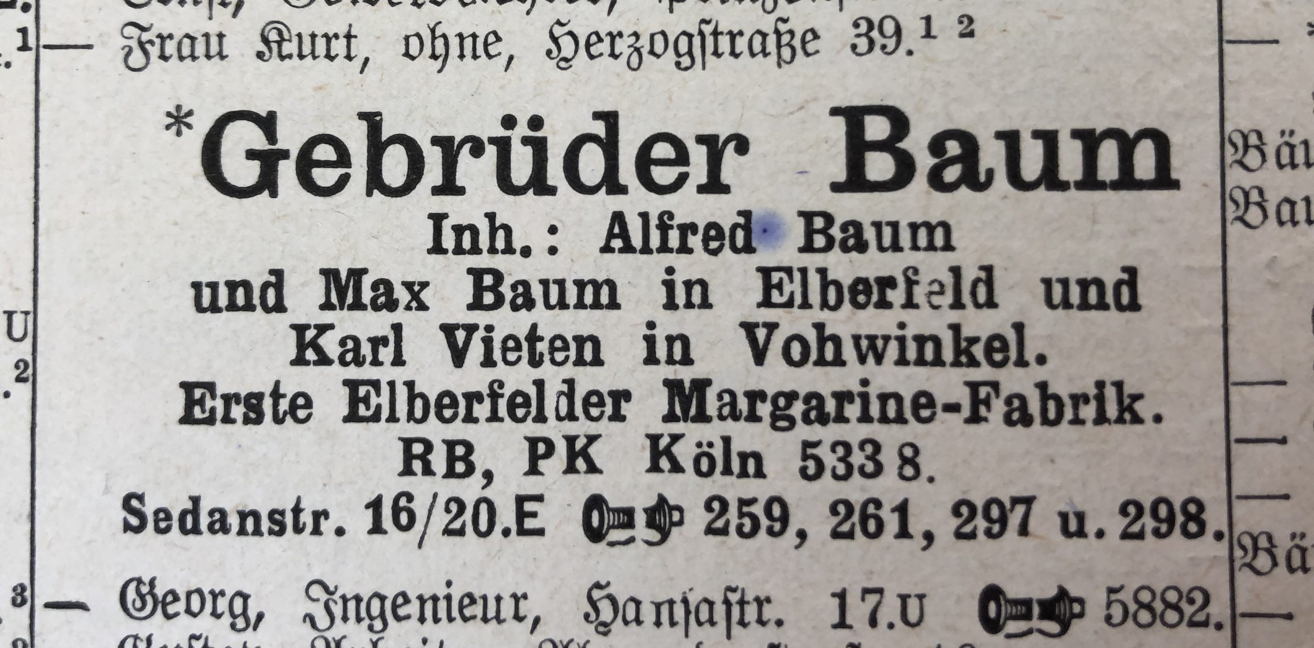 Eintrag der Margarinefabrik Baum im Elberfelder Adressbuch von 1925