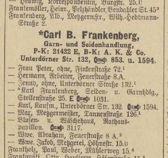 Das Barmer Adressbuch von 1925 führt ihn mit einer größeren Anzeige seiner Garn- und Seidenhandlung in der Unterdörner Straße 132 auf. An derselben Adresse wohnte auch eine Jenny Frankenberg, allerdings ohne Berufsbezeichnung, und Karl Frankenberg, der wiederum als Eigentümer einer Seiden- und Garnhandlung mit der Adresse Stollenstraße 25 aufgeführt ist.