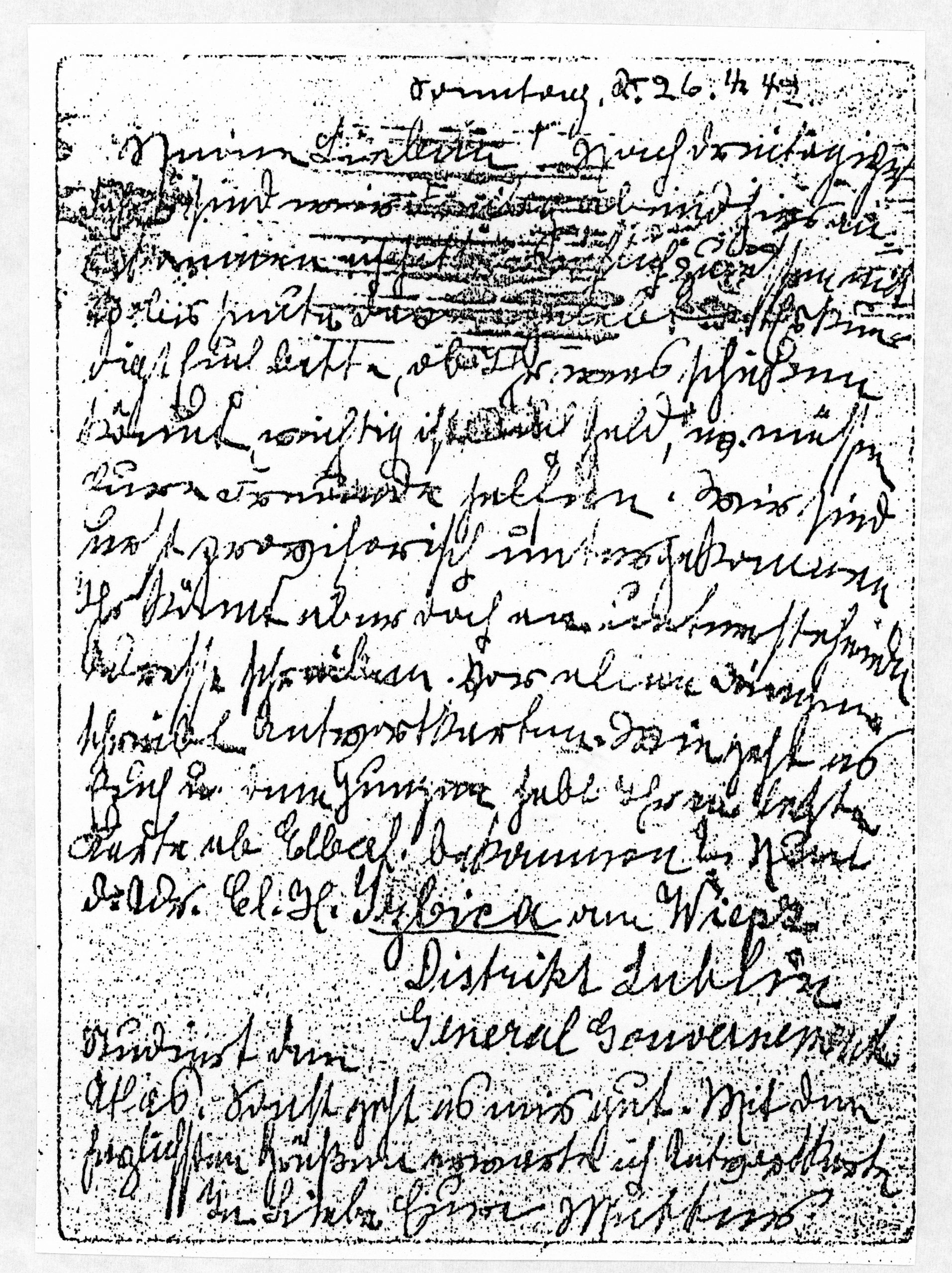 Meine Lieben! Nach dreitägiger Fahrt sind wir Freitagabend hier angekommen. Ich habe reichlich zu essen mit und bis heute davon gelebt. Erkundigt Euch bitte, ob Ihr was schicken könnt, wichtig ist auch Geld, evt. müssen Eure Freunde helfen. Wir sind erst provisorisch untergekommen. Ihr könnt aber doch an untenstehende Adresse schreiben. Vor allen Dingen schreibt Antwortkarten. Wie geht es Euch und den Jungen, habt Ihr meine letzte Karte ab Elberfeld bekommen? Nun die Adresse. Cl. H. Izbica am Wieprz, Distrikt Lublin.