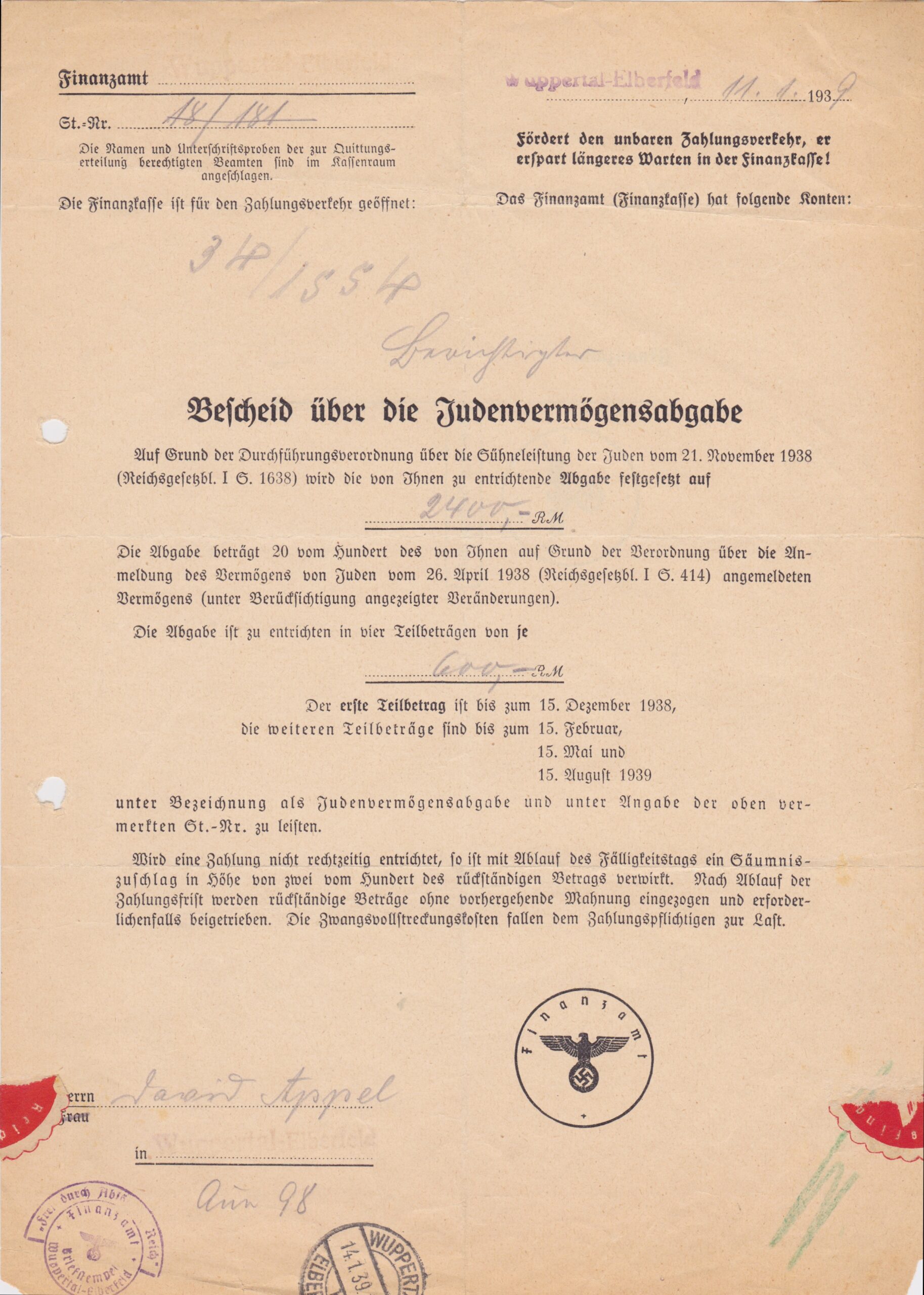 Dass die Eheleute Appel seit September 1941 den entwürdigenden „Judenstern“ sichtbar zu tragen hatten, wird an keiner Stelle der Korrespondenz zwischen Eltern und Söhnen erwähnt. Aus einer Bescheinigung des Wirtschaftsamts der Stadt Wuppertal geht hervor, dass Juden im Jahr 1942 keine Kleiderkarten mehr erhielten und nur noch ausnahmsweise Kleidung oder Schuhe kaufen konnten. Am 14. Februar 1942 durften sich Appels wegen einer dringend notwendigen Schuhreparatur in die Kundenliste der Lederhandlung Gebrüder Weistermann, Bökel 20, eintragen lassen. Darüber wie auch über die knappen Lebensmittelzuteilungen, über die Verbote, ein Radio oder Telefon zu besitzen und andere Schikanen schrieben Grete und David Appel nichts.