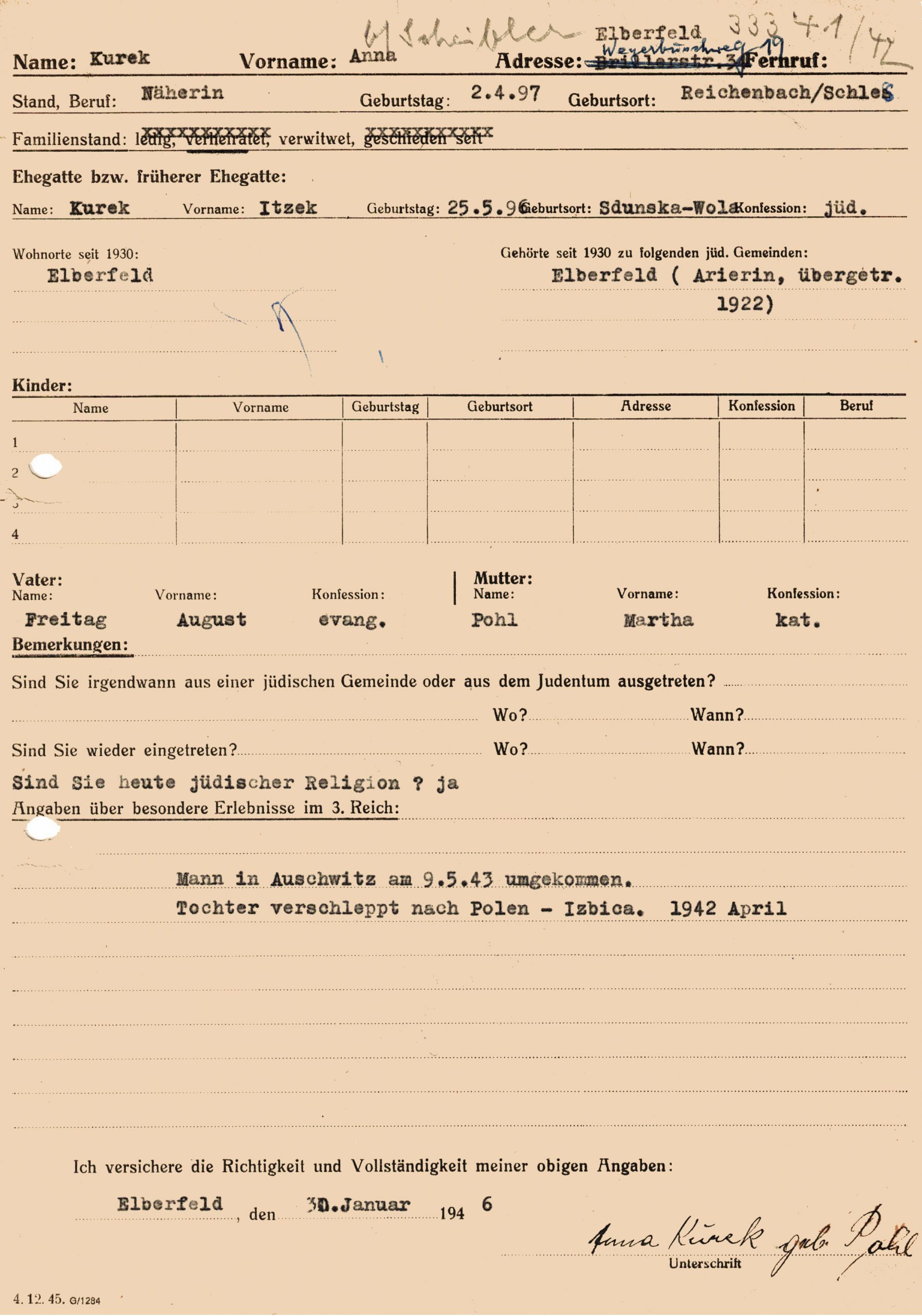 Formular, mit dem die Mutter Anna Kurek sich nach dem Krieg bei der jüdischen Gemeinde neu anmeldete
