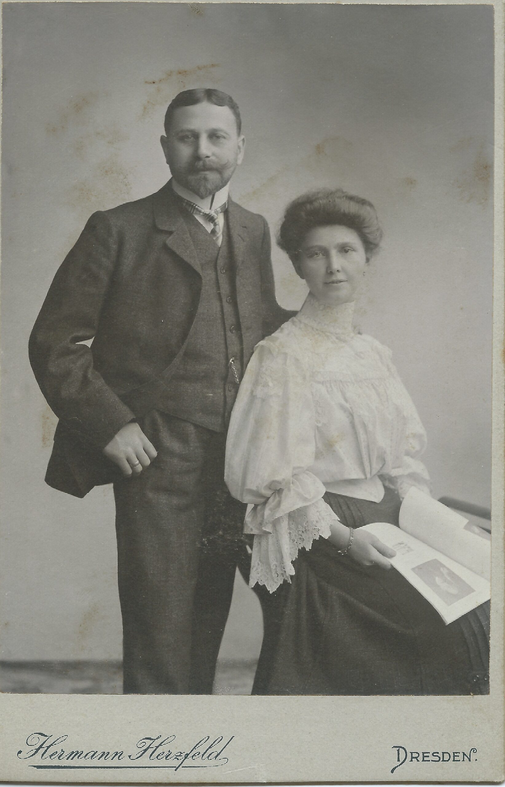 1897 heiratete Georg Olga Elisabeth Frister, geb. 12.12.1873, die vor der Eheschließung vom evangelischen zum jüdischen Glauben übertrat, weil Georgs fromme Eltern darauf bestanden. Seine Wohnung hatte das Ehepaar in der Bayreuther Straße 2 in Dresden. Auf dem Hochzeitsbild sieht man, dass Georg Caro ein eher kleiner Mann war. Als einziger in der Familie hatte er blaue Augen. Er war ein lustiger Mann, engagierte sich im Turnverein Friesen – wie übrigens auch seine Frau –, machte gern gereimte Gedichte, zeichnete gut und gern und bereitete Schnitzeljagden für die Kinder vor, die bald geboren wurden: Der erste Sohn, Walter, kam 1898 zur Welt, und 1901 die Tochter Johanna. Solange die Großeltern Simon und Johanna Caro lebten, wurden die Kinder im jüdischen Glauben erzogen. Walter hat als 13-jähriger 1911 sogar noch seine Bar Mizwa gemacht, aber Olga hatte mit dem streng orthodoxen Schwiegervater Simon Caro ihre Schwierigkeiten – sie konnte es absolut nicht leiden, dass ständig jemand in „ihren Kochtöpfen rumschnüffelte“. Nachdem die Eltern gestorben waren, ließen Georg und Olga ihre Kinder folglich sogar taufen, und auch Olga wurde später wieder evangelisch.