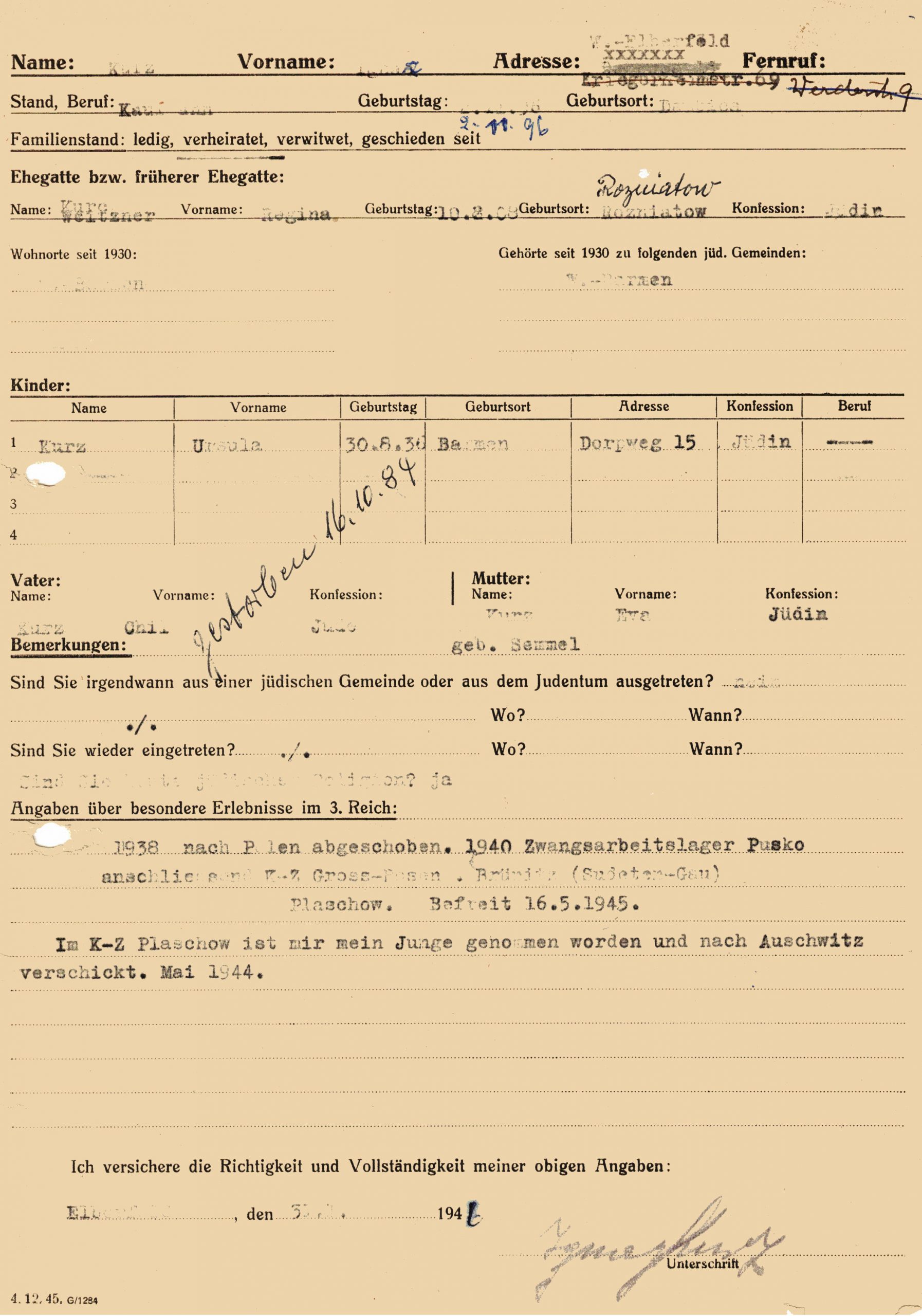 Seine Eltern waren die ganze Zeit bis zum Kriegsende in verschiedenen Ghettos, Zwangsarbeitslagern und Konzentrationslagern inhaftiert. Die Mutter wurde am 18. Januar 1945 im Zwangsarbeitslager Tschenstochau (Częstochowa), der Vater sogar erst am 16. Mai 1945 in Brünnlitz (Brněnec), einem Außenlager des Konzentrationslagers Groß-Rosen, befreit. Die kleine Tochter Ursula, bei Kriegsende gerade elf Jahre alt, konnte wie durch ein Wunder in einem Versteck bei einer polnischen Bauernfamilie überleben. Sie meldete sich mit ihren Eltern am 31. Januar 1946 wieder in der sich neu gründenden jüdischen Gemeinde an und emigrierte später nach Israel.