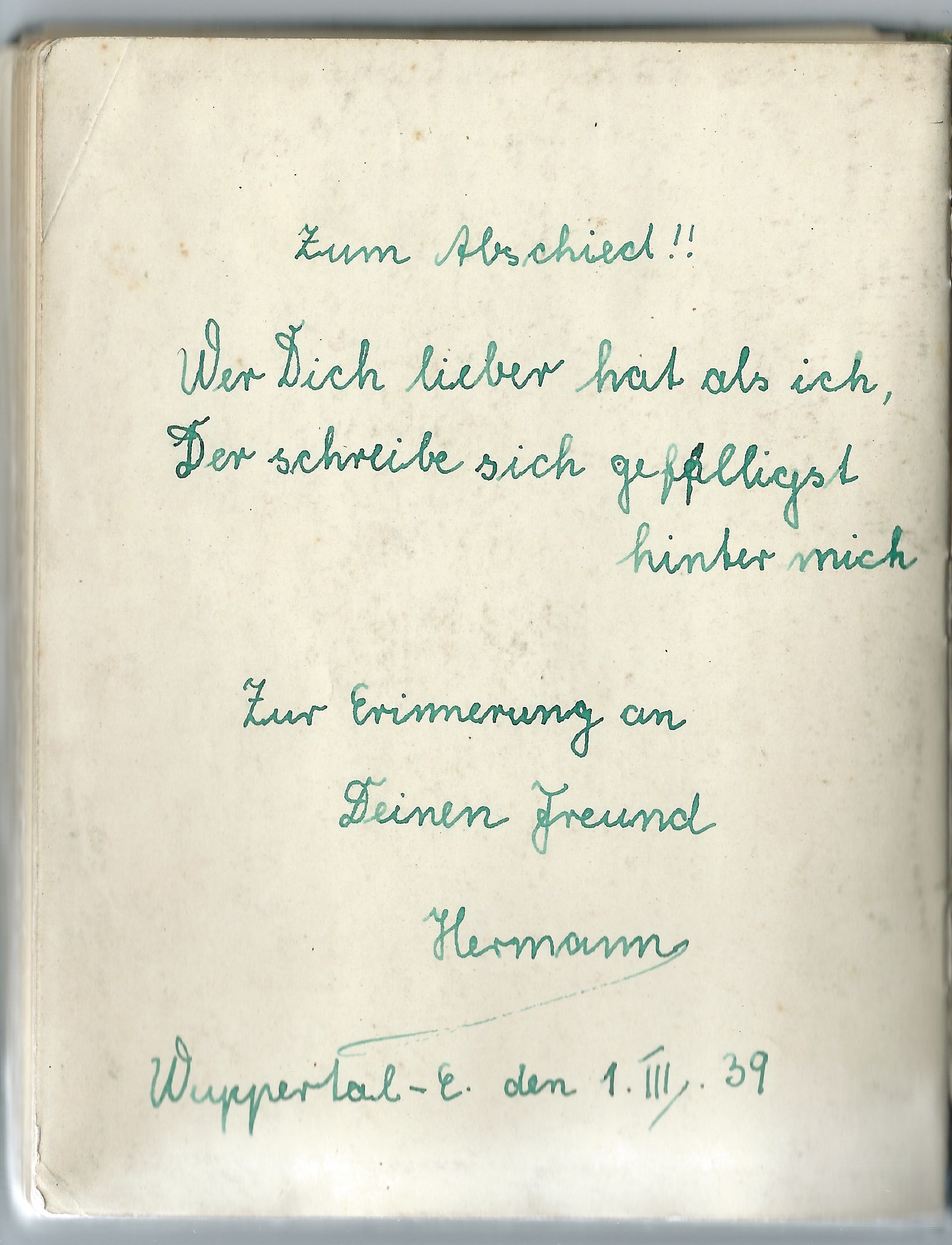Nach dem Pogrom im November 1938 versuchten die jüdischen Eltern in Wuppertal, ihre Kinder mit einem so genannten „Kindertransport“ nach England zu schicken. Es gab viele Abschiede. Hermann Mansberg schrieb am 1. März 1939 seiner Freundin Eva Anne Stern – die das Glück hatte, mit einem solchen Kindertransport nach England auszureisen – zum Abschied in ihr Poesiealbum auf die letzte Seite: