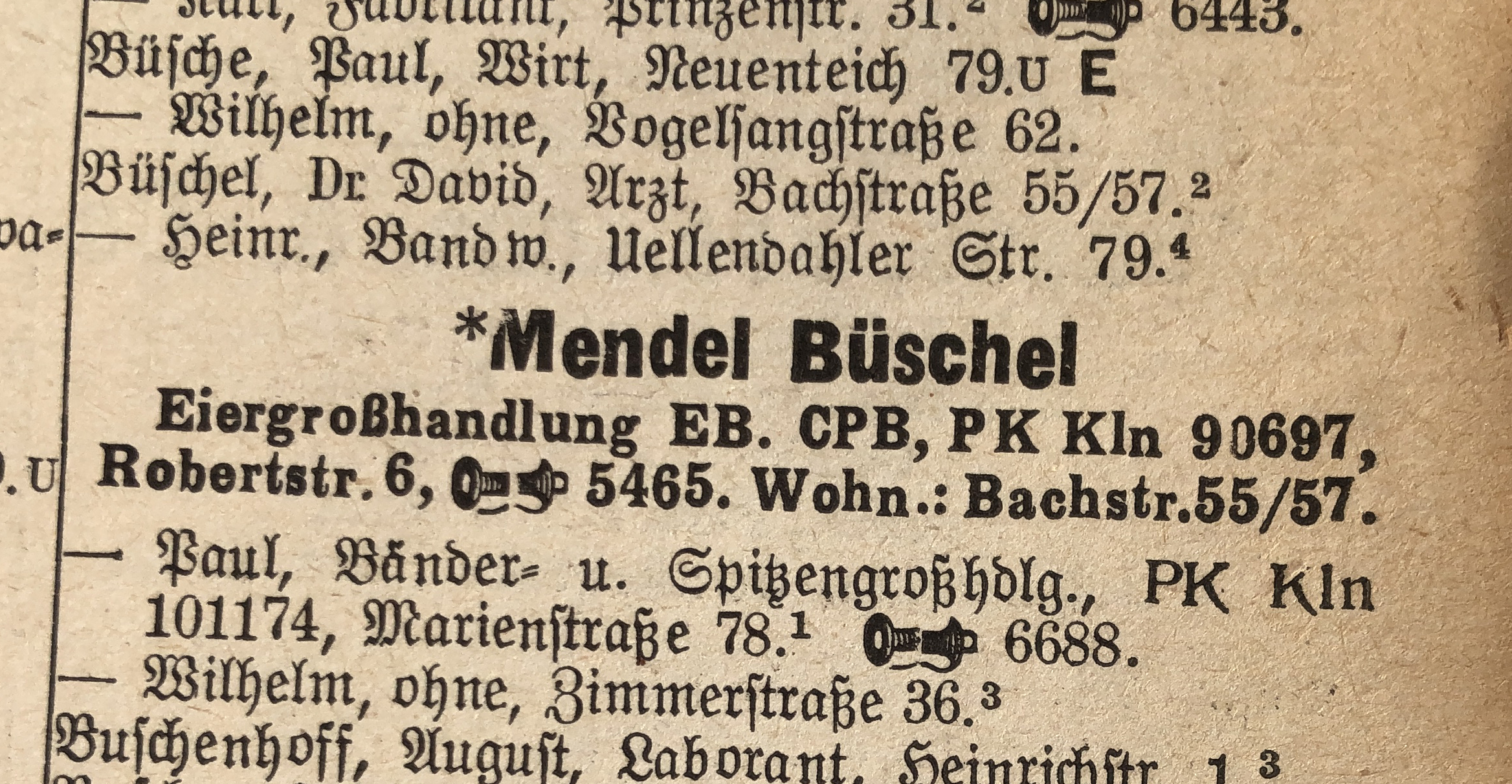 Jakob Büschels Vater Mendel betrieb in Elberfeld in der Robertstraße 6 eine Eiergroßhandlung – ein für aus Kolomea stammende Juden wohl recht häufiger Beruf.