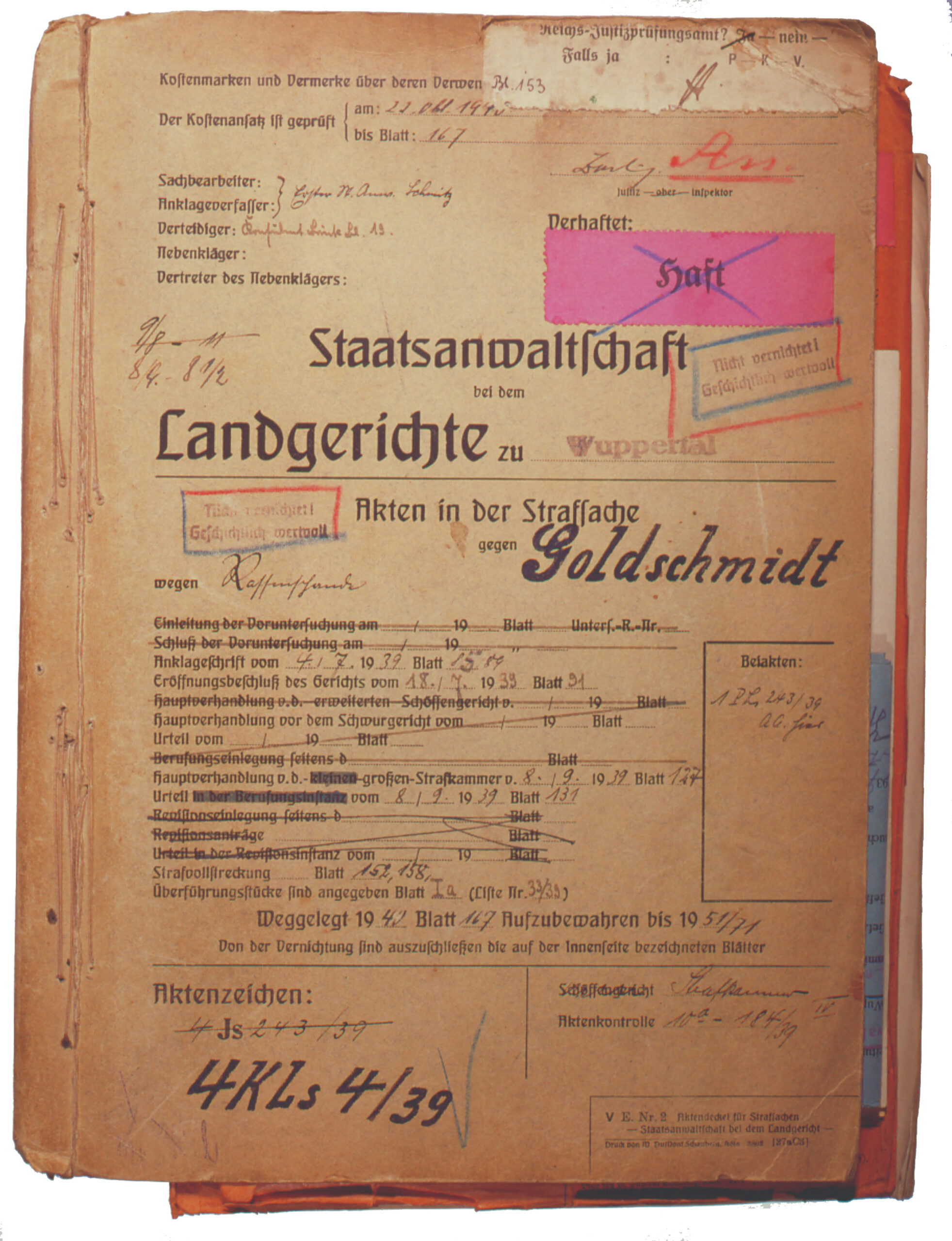 Die Akte schließt mit dem Vermerk vom 19.10.1940: „Der Kaufmann Lothar Israel Goldschmidt ist heute nach verbüßter Strafe in Vorbeugungshaft genommen worden.“ Am 8. September 1939 wurde er vom Landgericht Wuppertal zu einer Haftstrafe von einem Jahr und sechs Monaten Zuchthaus verurteilt, die er in Münster verbüßte. Dort wurde er noch Anfang 1940 aufgefordert, erneut seine Auswanderung einleiten zu lassen.