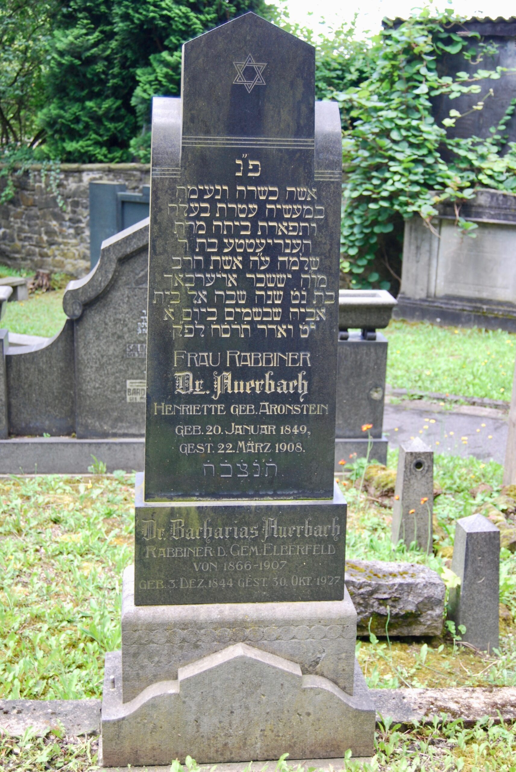 Grabstein der Eltern von Recha Auerbach auf dem jüdischen Friedhof am Weinberg, Rabbiner Dr. Zacharias und Henriette Auerbach