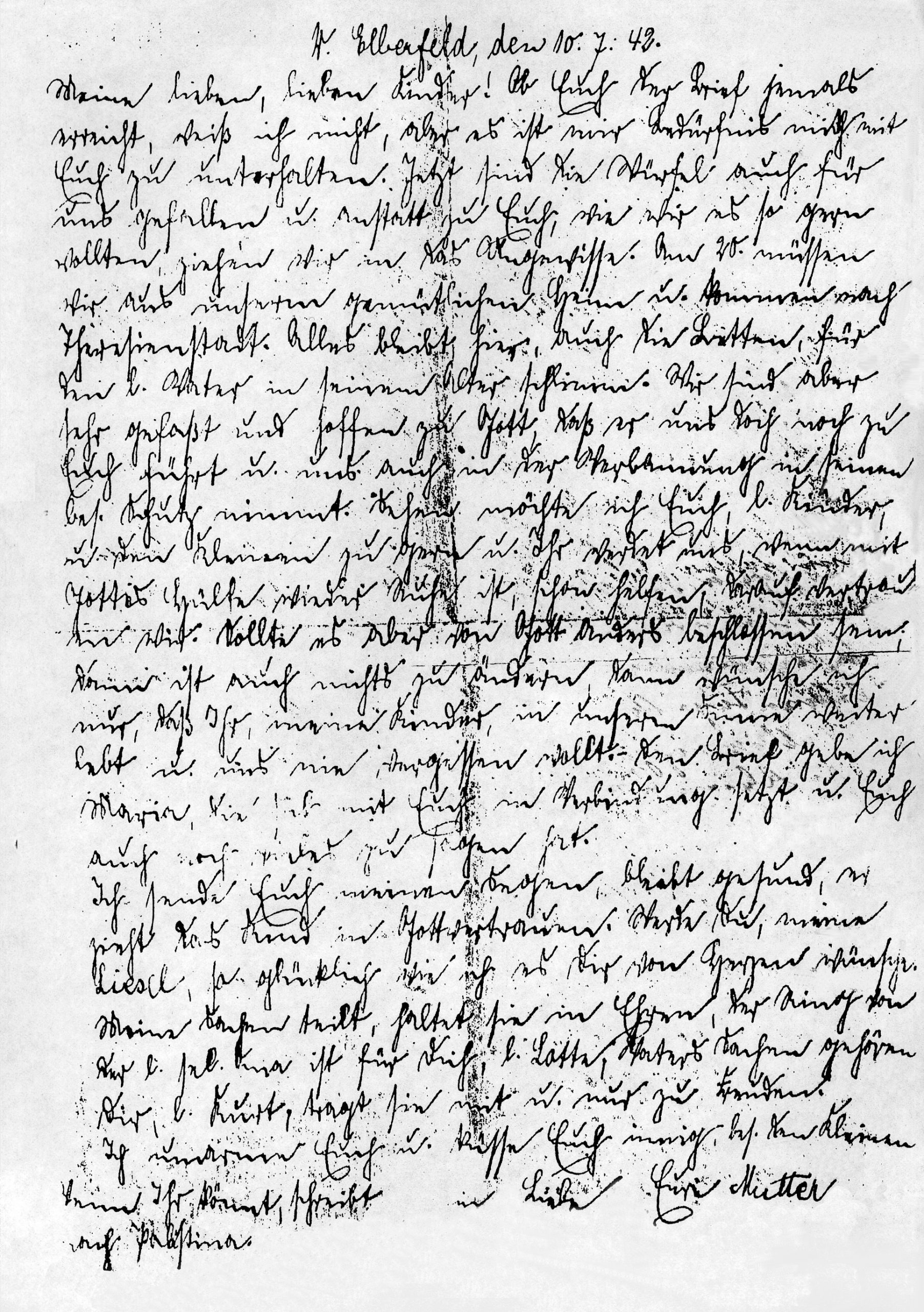 Ich sende Euch meinen Segen, bleibt gesund, erzieht das Kind in Gottvertrauen. Werde Du, meine Liesel, so glücklich, wie ich es Dir von Herzen wünsche. Meine Sachen teilt, haltet sie in Ehren, der Ring von der lieben seligen Oma ist für Dich, liebe Lotte, Vaters Sachen gehören Dir, lieber Kurt, tragt sie mit und nur zu Freuden. Ich umarme Euch und küsse Euch innig, besonders den Kleinen. Wenn Ihr könnt, schreibt nach Palästina. In Liebe Eure Mutter